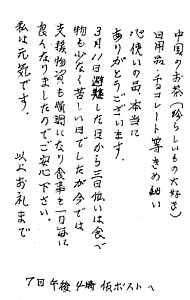 小川さんへの支援カンパ、大変ありがとうございました。すでに小川さんの口座確認が出来ましたので皆様からお預かりしました総金額を送金いたしました。小川さんからは通帳確認のお手紙をいただき手元に届いた確認もでき安心しています。小川さんから個人に返送されました手紙も紹介したいと思います。柴田さんからは小川さんの手紙を独り占めにするのはもったいないのでカメ集の皆さんにも見てもらいたいと電話で、後日コピーを送っていただきました。又、笹口代表には支援金のお礼の手紙を後日事務局宛にもお手紙をいただきました。元気でいるとのお便りに安心しています。 事務局 |